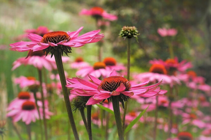 Ярко-розовые ромашки с темной сердцевиной выделяются на фоне любых растений, а на аромат этого цветка слетаются бабочки. Так что, посадив эхинацеи в саду, вы получите яркий красивый участок. Большие ромашки цветут в июле, но не в год посадки, а на следующий. Рассаду лучше высаживать в марте-апреле, чтобы у цветка было достаточно времени на адаптацию.