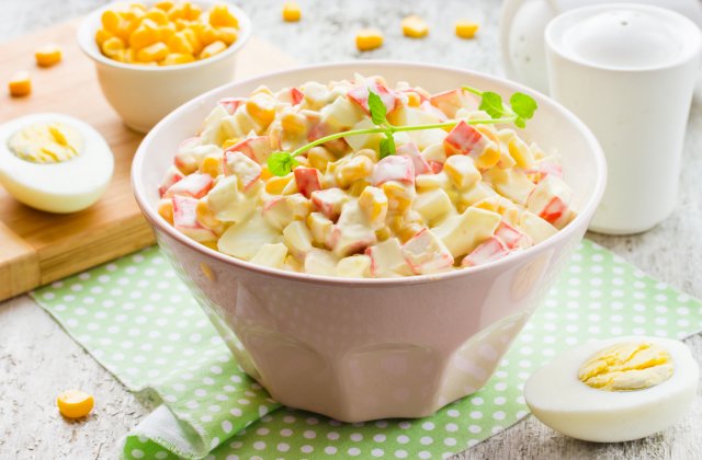 Вам понадобятся: 200 г крабовых палочек, 4-5 отварных яиц, 1 банка консервированной кукурузы, соль и майонез по вкусу.