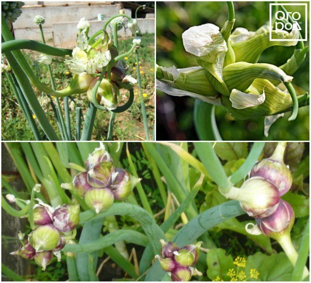 Чеснок тоже относится к роду Аллиум. Это растение известно каждому. В первый год вырастают отдельные зубчики, а уже на второй формируется сложная луковица, которая состоит из зубков, покрытых тонкой пленкой. Также у чеснока съедобны и довольно декоративны листья, стрелки и цветоносы.