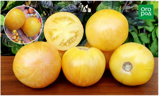 Среднеспелый индетерминантный сорт. Куст мощный, достигает 1,8-2 м в высоту, сильно разрастается, желательно вести в 2-3 стебля. В кистях по 5-7 томатов. Плоды округлые, слегка опушенные. Окраска – белые полоски на кремовом фоне. Масса плодов – 120-200 г, мякоть нежная, сочная, плотная. Назначение универсальное, плоды применяются как для засолки, так и для употребления в свежем виде. Отличный сорт для аллергиков. Хорошо завязывается в прохладное и пасмурное время.