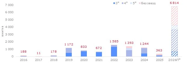 Рынок апарт-отелей Петербурга в 2025 году не оправдал ожиданий по рекордному вводу: ввели 2,2 тыс. юнитов (42% от плана в 5,2 тыс.). Из-за моратория на штрафы девелоперам и слабого спроса на строящиеся объекты сроки сдвинулись, накопив отложенное предложение. В 2026 году рынок может побить 10-летний рекорд: ожидается 16 объектов на 6,8 тыс. юнитов (в 5,5 раза больше, чем в Москве). Однако от ввода до классификации номеров проходит 1–1,5 года. В 2025 году классифицировали лишь 363 юнита, а в 2026 году — около трети (примерно 2 тыс.).