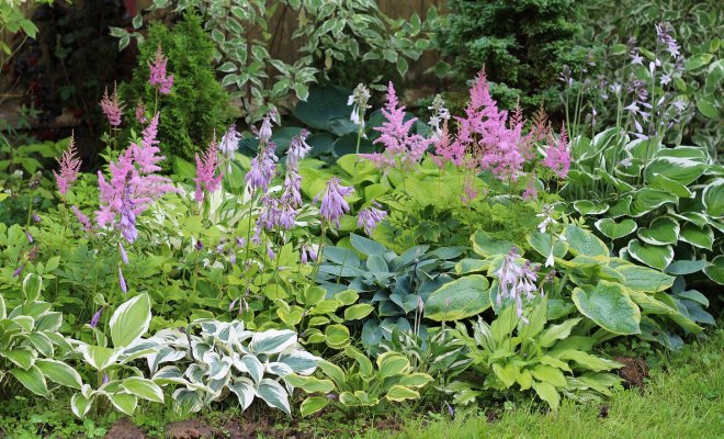 Традиционно хоста считается теневыносливым и даже тенелюбивым растением, и высаживают ее чаще всего в затененных уголках сада рядом с астильбами, папоротниками, гейхерами и другими неприхотливыми культурами. Однако такое место посадки подойдет лишь хостам с темно-зелеными, голубыми и белыми листьями – они в тени чувствуют себя прекрасно.