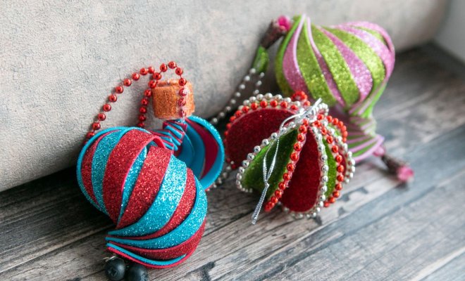 Для создания подобных шаров вам понадобится глиттерный фоамиран двух цветов. Можно использовать самоклеящийся, тогда работы будет меньше. А также подготовьте клей-пистолет, ножницы, линейку, декоративную нить или ленту.
