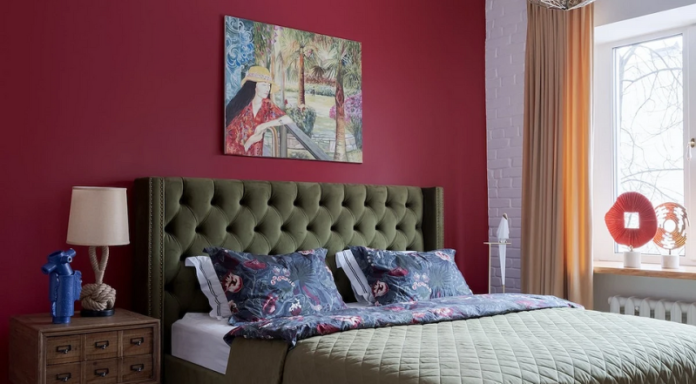 В основу дизайна этой квартиры легла некая театральность и даже ироничность. В отделке большинства комнат использовали яркую палитру: стены в гостиной выкрашены в насыщенный синий, а в спальне в ягодный красный. В кабинете обои с активным клетчатым узором, который отсылает к английской классике (этот же мотив повторяется в ванной через портрет королевы). Пространство кухни и прихожей оформлено в светлых тонах, но нельзя сказать, что оно лишено цвета. В зоне готовки сразу два ярких акцента: синий гарнитур и красный холодильник. А всю стену узкого коридора занимают встроенные шкафы глубокого зеленого цвета.