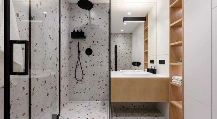 Этот компактный санузел с душевой вместо ванны оформлен в светлой палитре. В качестве фонового цвета использовали белый: он визуально делает пространство больше и создает идеально подходящее ванной ощущение чистоты, даже некоторой стерильности. Холодную плитку дополняет фактура дерева, которая представлена в системах хранения: тумбе под раковиной и стеллаже сбоку. Еще одним активным элементом выступает плитка тераццо, которой облицевали пол и часть стен. Все вместе выглядит стильно, нескучно и неперегруженно. Отдельного внимания заслуживает функциональное открытое и закрытое хранение: в небольшой ванной комнате удалось оборудовать не только вместительную тумбу под раковиной, но и полноценный стеллаж с подсветкой у стены.