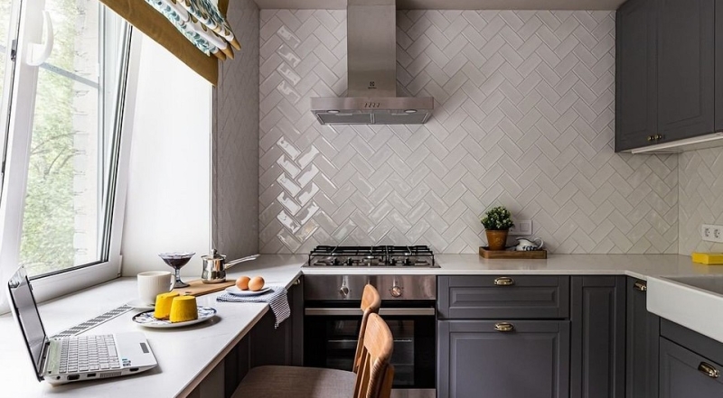 Интерьер этой кухни выглядит просто, но благодаря нескольким эффектным приемам очень стильно. Палитра построена на двух базовых оттенках: сером и белом. В первом оформлены фасады гарнитура, а второй выступает в качестве доминанты в отделке. Сдержанный лоск интерьеру придают блестящая металлическая фурнитура на мебели и глянцевая плитка на фартуке. Она уложена елочкой и благодаря этому выглядит эффектно. Яркости нейтральной палитре придали с помощью текстиля, выбрав римскую штору с активным узором. Основная столовая зона находится в гостиной, на кухне же оформили уютный уголок для завтраков на подоконнике. Остальное пространство отдано под вместительный гарнитур.