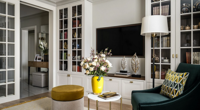 В этой гостиной дизайнеру удалось совместить элегантность классики и ощущение домашнего уюта. Палитру выбрали спокойную, выстроив ее вокруг бежево-шоколадных тонов с добавлением небольшого количества ярких цветов: желтого, насыщенно-бирюзового, золотого. Ставку сделали на природные сочетания, которые удачно объединяют и насыщенные, и нейтральные оттенки. Мебель подобрали классических форм, ее дополняют спокойный декор и разнообразный текстиль. В небольшой гостиной удалось предусмотреть достаточно вместительную систему хранения, которую адаптировали под коллекцию керамики, которую собирает владелица.
