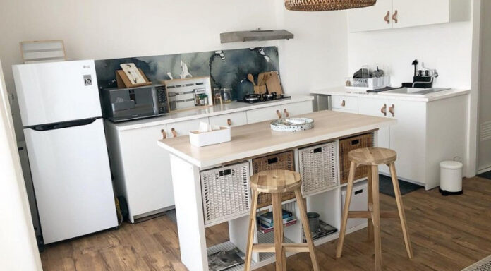 Проектируя кухню мечты, многим приходится отказываться от кухонного острова стоимость такого решения высока. Кроме того, многие островные конструкции массивны: либо не помещаются в комнате вообще, либо затрудняют передвижения. Но в этом примере разом решили обе проблемы, создав остров из популярнейшего стеллажа «Каллакс» и столешницы «Линнмон». Решение супербюджетное, но смотрится стильно, уместно. Как обычно, внутри блоков-квадратов можно использовать плетеные корзины, закрытые коробки или создавать декоративные композиции. Размеры стеллажа-основания и самой столешницы невелики, поэтому выглядит все компактно.