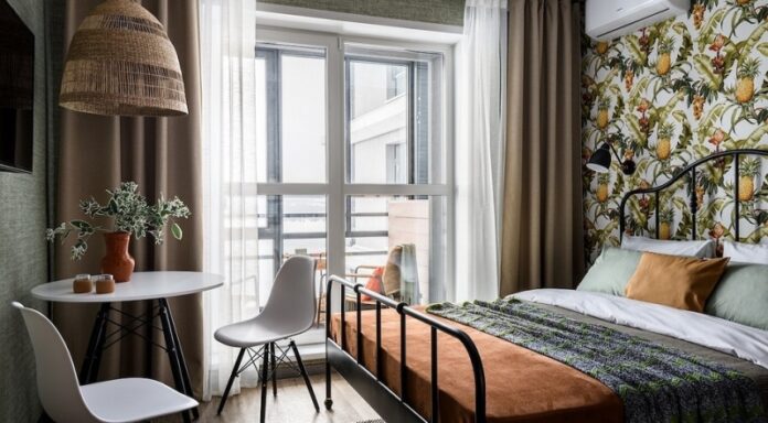 Дизайнер Наталья Кадочникова превратила квартиру в две студии для краткосрочной аренды. И площадь той, где уместилась кровать, без учета балкона совсем небольшая, а если учитывать только комнату, то она еще меньше 15, 3 квадратных метра. Интерьер выполнен с отсылками к тропическому стилю. Здесь использовали яркие обои с соответствующим сюжетом за изголовьем кровати и добавили сочный терракотовый цвет в отделке входной зоны и стены рядом с кухней. Стена же напротив кровати в приятном зеленом оттенке. Кухонный гарнитур компактный, но с необходимой техникой в виде мини-холодильника, микроволновой печи и варочной панели на две конфорки. При входе есть небольшой шкаф.