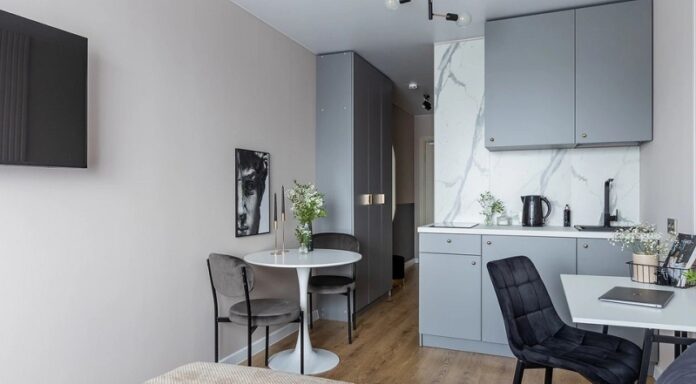 Эти апартаменты предназначаются для сдачи в аренду, поэтому на 19,7 квадратах нужно было предусмотреть максимум полезных зон. Кухня получилось крошечной, но в ней есть абсолютно все необходимое для приготовления и хранения еды. На первый взгляд это кажется невероятным, но внутри гарнитура нашлось место для микроволновки и даже холодильника. Несмотря на то, что техника не встраиваемая (ее разместили прямо внутри шкафов), она удачно спрятана за дверцами. Кроме этого, дизайнер предусмотрела несколько отсеков для хранения посуды и аксессуаров, а на столешнице удалось разместить небольшую варочную панель.