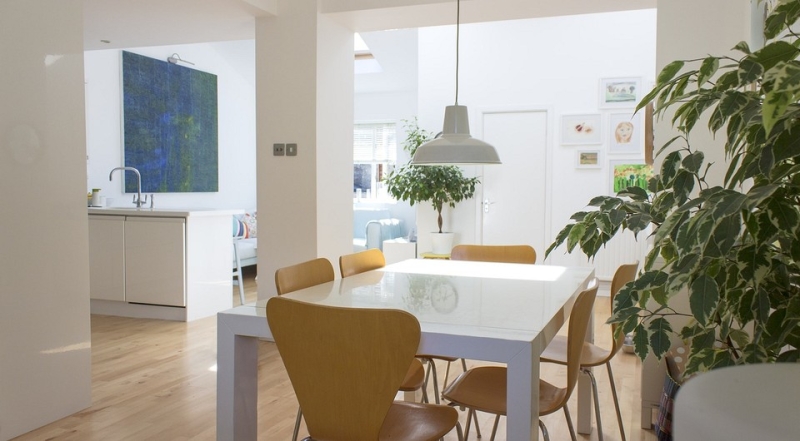 Не бойтесь постелить ковер под обеденным столом или повесить занавески на окно рядом. Это могут быть не портьеры в пол, а, например, римские или рулонные шторы. Поставьте стулья с мягкой обивкой или украсьте стол красивой скатертью. Просто выбирайте ткани с защитной пропиткой или те, которые можно стирать в машинке.