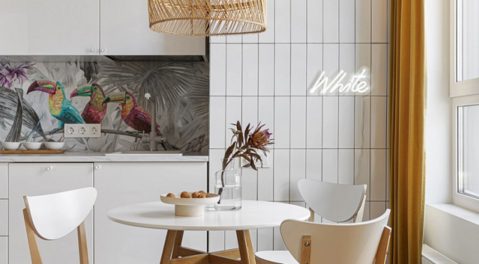 Интерьер этой квартиры дизайнер оформила для себя и своей семьи, выбрав нетипичный южно-американский стиль. Яркие тона здесь соседствуют с фоновым оформлением, а балансируют их натуральные материалы отделки и мебели. Палитра преимущественно теплая, что делает кухню максимально уютной. Для гарнитура выбрали необычный оттенок вареных раков так его описывает сама дизайнер. Его дополняют зеленый диван и деревянная столовая мебель. Отделка получилась нейтральной, но «с характером». Так, на стене в столовой зоне появились светло-бежевые обои с ироничным и немного наивным сюжетом: на них изображены лесные заросли, в которых спрятались еноты.