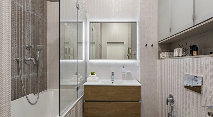 Встроенные шкафчики, полки в нишах и комод под раковиной показываем, как можно с пользой организовать свободное место в санузле.