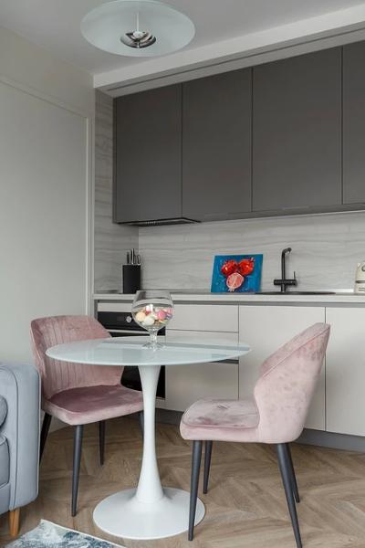 Светлые оттенки в оформлении небольшой кухни это не просто красиво. Чем легче визуально будет казаться интерьер, тем больше мебели и других предметов вы сможете безболезненно вписать в маленький метраж. Поэтому фасады кухонного гарнитура идеально сделать лаконичными и светлыми. Кстати, такая палитра еще и практична, ведь загрязнения на белом, бежевом или бледно-сером фоне менее заметны, нежели на цветном или темном. Да и в целом светлый интерьер выглядит гораздо опрятнее и «чище».