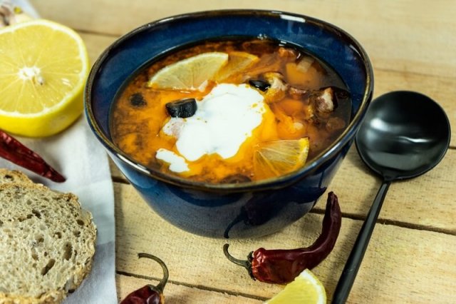 Вам понадобятся: 3 л мясного бульона (можно использовать воду), 250 г квашеной капусты, 400 г любых колбасных изделий, 2-3 картофелины, 1-2 соленых огурца, 1 помидор (или 50-70 г кетчупа), маслины, оливки, лимон, зелень, сметана, соль и специи по вкусу.