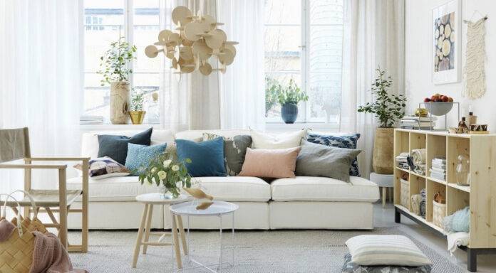 Могут ли отголоски лофта тоже быть по-весеннему нежными? Еще как! Эта гостиная со стеной, имитирующей кирпичную кладку, совсем не выглядит излишне индустриально и брутально. Причина текстиль приятных весенних оттенков и декор. Лимонный, нежно-розовый, сиреневый, которые встречаются в разных элементах по всей комнате, ассоциируются с солнечным апрелем и создают расслабляющую атмосферу в комнате. Конечно, не обошлось без цветочного букета. Причем различные композиции в разных вазах. Такой прием можно взять на вооружение и иметь в запасе 2-3 отличающихся по стилю вазы.