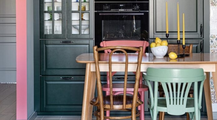 Вы можете повторить этот прием поискать стулья на досках объявлений в интернете и перекрасить своими руками. Или взять пару новых стульев, дополнив их винтажными. Экспериментируйте!