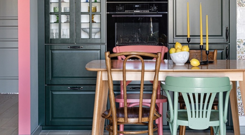 Прием, который позволяет выделить обеденную зону, а еще, возможно, сэкономить композиция из разных обеденных стульев, составленных за одним столом. Его, в частности, применила дизайнер Маргарита Зенова в этом проекте. Стулья здесь винтажные, и все разной формы. Два оставлены в цвете натурального дерева, один окрашен в розовый, и еще один в мятный.