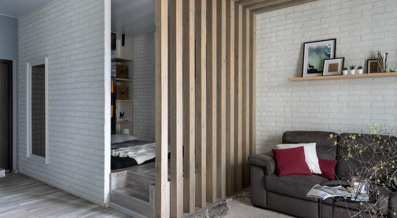 Обстановку этой квартиры определила ее небольшая площадь. Вместо традиционной тумбы под ТВ обустроили подиум, который захватывает и пространство под телевизором, и место под кроватью. Ее пришлось немного приподнять, зато внутри появился просторный отсек для хранения вещей. Решение с объединенным подиумом под кроватью и ТВ позволило выжать максимум из метража квартиры. Между функциональными зонами нет пустых промежутков, каждый сантиметр задействован с пользой.