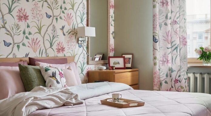 В этой спальне использовали традиционный декораторский прием: выделили одну из стен акцентными обоями с цветочным узором. Но на этом дизайнер не остановилась и использовала тот же рисунок для штор и декоративной подушки на кровати. Получился очень гармоничный и эффектный интерьер. Несмотря на обилие узоров, комната выглядит спокойно из-за того, что все акценты выполнены в неяркой цветовой гамме.