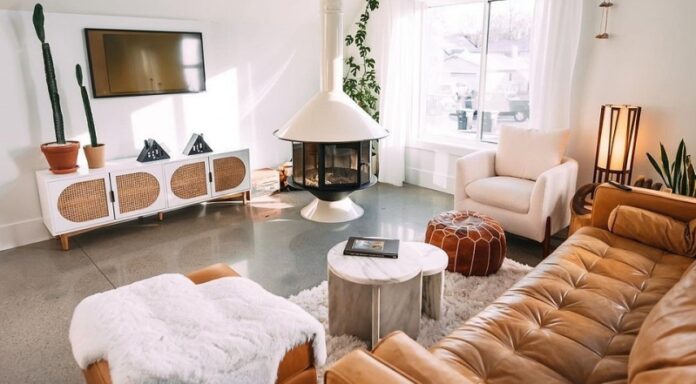 В этом доме прекрасно все: льющееся из больших окон солнце, минимум стильной и простой мебели, яркие уютные акценты в виде ковров-шкур и современного камина. Отделка выполнена максимально просто: стены и потолок выкрашены в одинаковый оттенок белого. На его фоне дерево и керамическая плитка смотрятся очень естественно. В таком домике хочется провести выходные или целый отпуск места для этого достаточно. На двух этажах обустроены самые разные зоны: от уютной спальни и санузла до кухни-столовой и библиотеки.