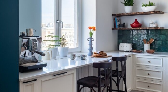 Большую роль в сложившемся интерьере и в том, какое впечатление он производит, играют цвета и окно на кухне оно расположено практически по центру стены с нижними базами, под ним мойка. Окно не зашторено, зато эффектно отделано молдингами. Светлый фартук из глянцевой плитки, белая столешница играют на контрасте с темно-зелеными фасадами. Получился интерьер в духе скандинавских домов.
