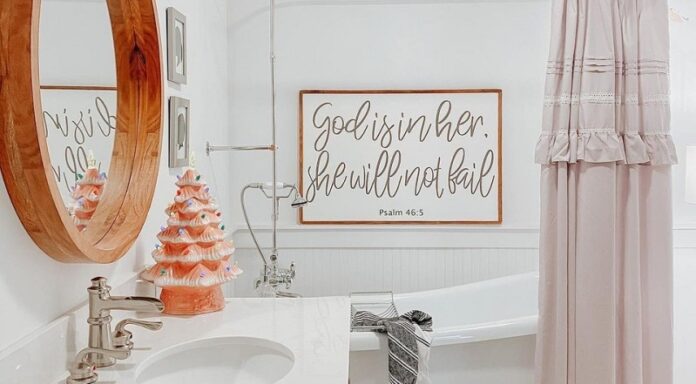 Тематический текстиль, белый декор и мини-елка на раковине собрали идеи, как красиво разместить украшения в небольшой ванной комнате.