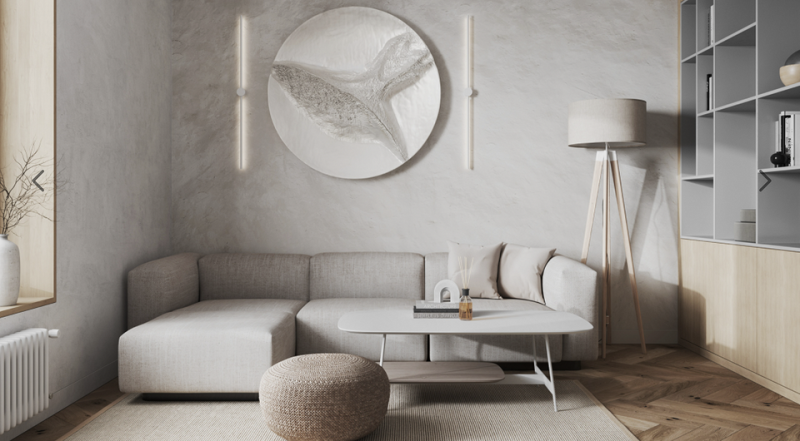 Главная особенность этого интерьера здесь почти нет острых углов. Диван и кресла обтекаемой формы, плавные линии на картине, округлые светильник и журнальный столик. Все это создает мягкую атмосферу окутывающего облака, а светлая цветовая гамма добавляет уюта.
