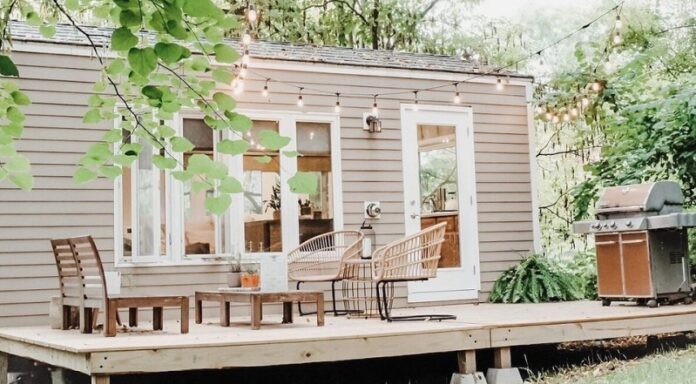 Благодаря большому количеству окон по обеим сторонам домика пространство утопает в естественном свете. Светлый деревянный пол, белые стены и мебель, а также аксессуары пастельных оттенков усиливают это ощущение.