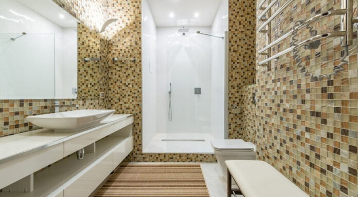 Мозаика, бежевая глянцевая плитка, декор и фотообои перечисляем приемы, от которых стоит отказаться в отделке санузла.