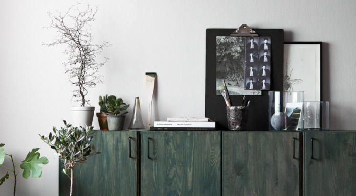 Дорого смотрятся не только золотистые глянцевые поверхности. Например, добавьте в интерьер вазу из матового полупрозрачного стекла. Глубокий зеленый оттенок будет сочетаться с растениями и впишется в любую цветовую гамму. Чтобы вся композиция выглядела пропорционально, не ставьте в вазу много цветов для элегантного акцента хватит даже одной зеленой веточки.