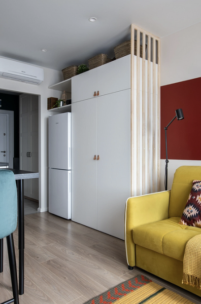 Если шкафы не достают до потолка, на них можно расставить плетеные корзины с крышкой. Они станут дополнительным местом для хранения сезонных вещей или мелочей, которые редко используются. Такое решение выглядит аккуратно и хорошо перекликается с деревянной мебелью и отделкой в комнате. Особенно хорошо подходит для эко- или скандинавского стиля.