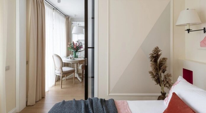 Еще одно решение для межкомнатных дверей выбрать скрытое полотно и замаскировать его под отделку. Для этого нужны специальная конструкция распашной двери, которая максимально сливается со стеной, и тот же цвет краски, что и на всей поверхности. Это решение позволит не перегружать маленькую комнату дополнительными деталями: например, если замаскировать вход в гардеробную при спальне, такая дверь будет практически незаметна в общем пространстве.