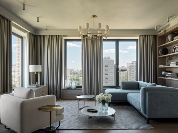 Расстановка мебели в гостиной влияет на то, как будет восприниматься интерьер. Например, если комната используется как пространство для отдыха и общения, есть смысл расставить мягкую мебель по кругу, как в этом проекте. Так все находящиеся в гостиной будут сидеть лицом друг к другу, а это располагает к беседе. Еще один интересный прием, который здесь использовала дизайнер, диван и кресло не придвинуты к стене и не задвинуты в угол, вокруг них есть свободное пространство. Это делает комнату визуально просторнее.