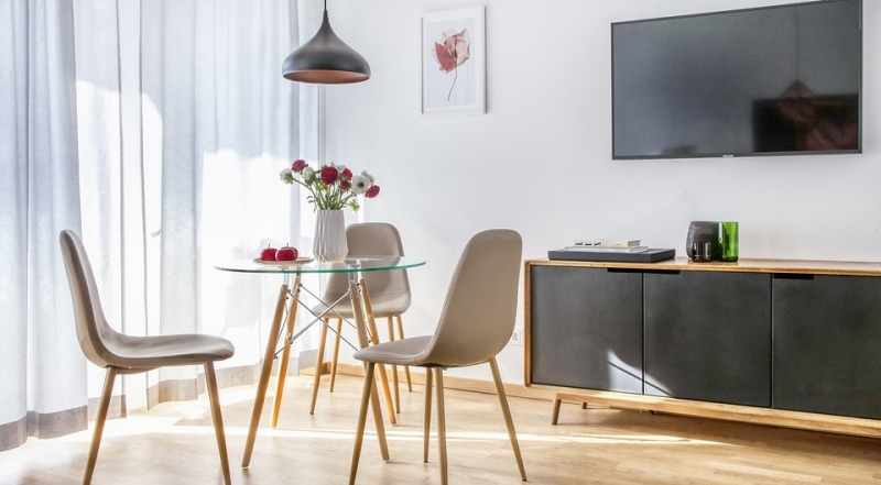 Как мы уже отмечали выше, любой стол можно отодвинуть от стены, чтобы дополнительно уместить за ним одного-двух человек. Но раскрыть потенциал круглой модели можно еще больше, если она всегда занимает место по центру комнаты. Хозяйка интерьера на фото соединила гостиную и столовую зоны (сама кухня совсем крошечная). И, несмотря на небольшой диаметр стола, обеденная группа уже не выглядит маленькой, а вокруг свободно встают 4 стула. Кстати, они не комплектные. Комбинация разных по силуэту и цвету стульев смотрится нескучно и, помимо практической, наделяет столовую зону декоративной функцией.