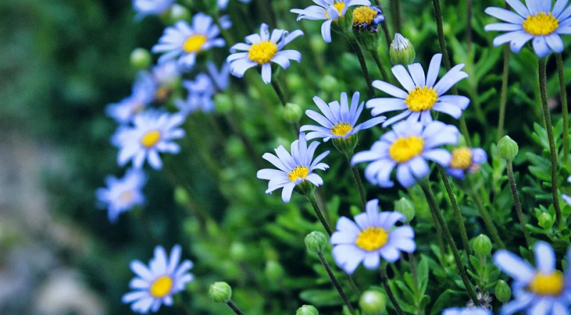 Симпатичные голубые цветочки это фелиция. Растение простое, но в этой простоте кроется особый шарм. Тем более что особых требований к почве оно не предъявляет и сможет расти в истощенной земле. Так как цветок происходит из Южной Африки, с солнцем отношения хорошие можно смело высаживать рассаду в солнечную клумбу. Фелиция начинает цвести ближе к середине лета, а длится этот период вплоть до двух месяцев довольно продолжительно. Пушистые кустики с синими соцветиями вырастают почти до метра, в районе 40-50 см.