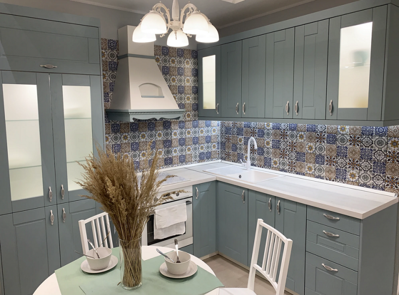 Если вас привлекают цветные фасады, но без экстремальных решений, то зеленые или синие тона лучшие варианты. Например, эта кухня припыленного мятного цвета. Оттенок сложный, благородный, именно такие выигрышнее всего смотрятся в интерьере. Обыграть фасадную часть можно по-разному, например, с помощью ручек и наличия застекленных шкафов. Может получиться любой стиль: кантри, неоклассика, даже минимализм. Как всегда, усилить стилистику помогут фартук, столешница, аксессуары. Эти фасады выполнены из МДФ, а покрыты прочным термопластиком.