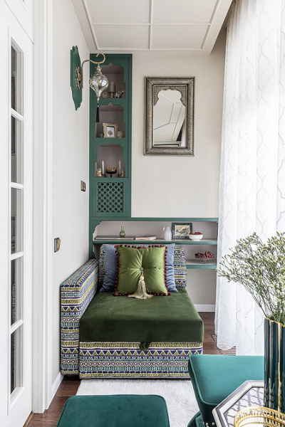 Самый простой и бюджетный способ, который не потребует дизайнерских навыков и сложной подготовки, поставить на балконе неглубокий открытый стеллаж или повесить полки. На нижних можно разместить коробки или корзины, на верхних сезонный декор, который легко менять. Если есть место, поставьте рядом кресло с мягким пледом или сделайте небольшую систему хранения. Этот прием хорош тем, что обновлять внешний вид лоджии можно без особых усилий.