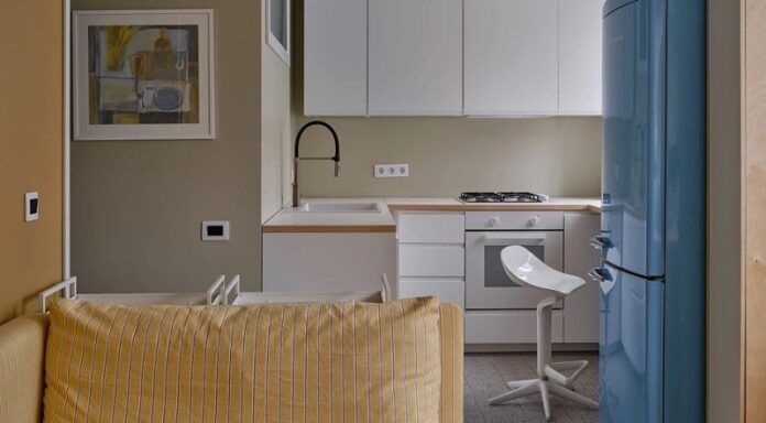 В этом проекте на площади 5,9 квадратов получилось найти место для полноразмерного углового гарнитура, столовой группы и большого холодильника. Он же стал главным цветовым акцентом в нейтральном интерьере. Обеденный стол сделали из подоконника, но от этого он не стал менее удобным в использовании, а сэкономленного места как раз хватило, чтобы поставить крупную технику. Таким образом кухня вместила весь необходимый функционал, и не пришлось задействовать другие части квартиры.