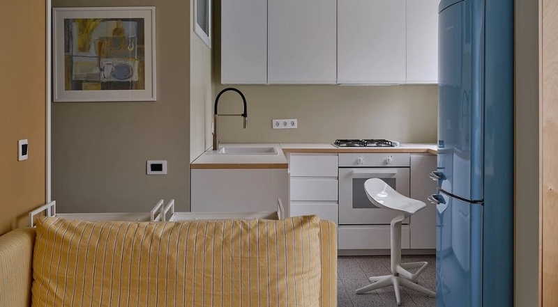 Со столовой зоной, полноценным холодильником и даже диванчиком показываем крошечные кухни, где есть все.