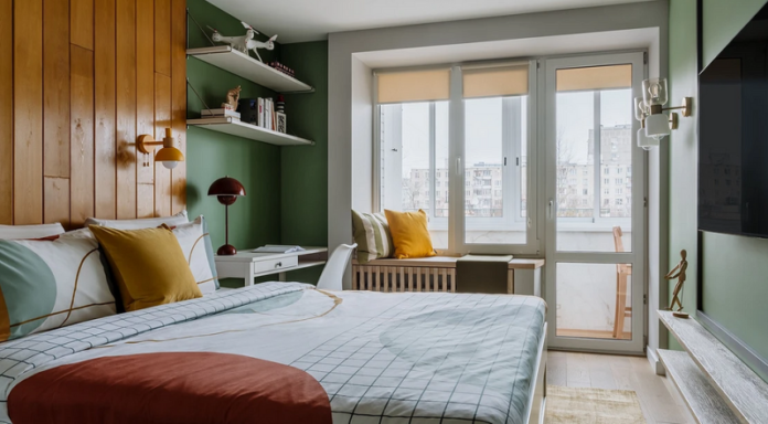 Актуальность не потеряют идеально сочетающиеся между собой цвета, даже насыщенные, как в этой спальне. Желтый, зеленый и темно-красный перекликаются в отделке, текстиле и аксессуарах вроде светильников. В итоге получается яркий, но гармоничный интерьер, который даже спустя несколько лет не будет раздражать или выглядеть неуместно.