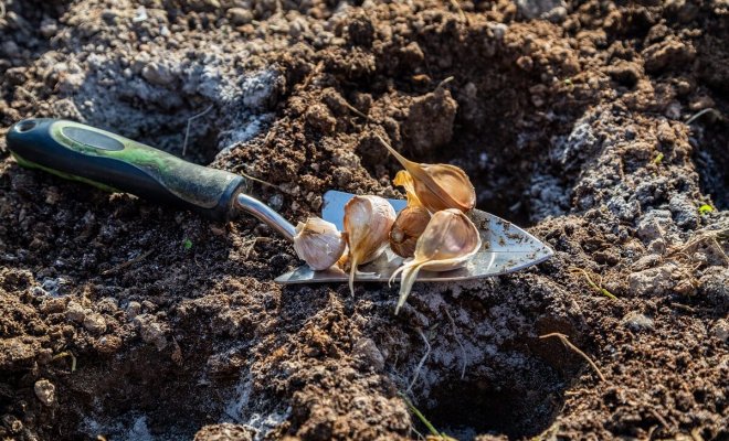 На 1 кв.м земли следует внести ведро перепревшего компоста, перегноя или биогумуса и добавить 1 стакан золы. Перекопайте и подготовьте грядку за неделю до предполагаемой даты посадки, чтобы земля осела. Если на участке, где вы собираетесь посадить чеснок, уже растут сидераты, их следует скосить и заделать в землю как минимум за две недели до посадки чеснока. Ускорить разложение органики в почве помогут полезные почвенные микроорганизмы. Поэтому землю желательно полить раствором ЭМ-препарата: например, Байкал ЭМ1, Экомик Урожайный, что будет способствовать более быстрому образованию гумуса и оздоровлению почвы.