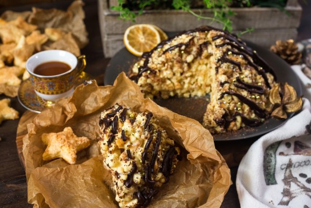 Готовя это лакомство, за его внешний вид точно можно не бояться. Ведь даже если коржи при выпечке не «вырастут», как того требует рецептура, они все равно будут разделены на мелкие части и обильно политы кремом. Этот торт также лучше украсить расплавленным шоколадом, но даже если вы этого не сделаете, десерт не станет менее вкусным.