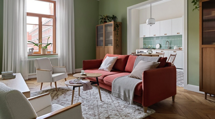 Эта квартира находится в старом доме, что определило концепцию: интерьер, в котором есть элементы классики, современного сканди и винтажа. Для гостиной выбрали натуральную палитру, в которую органично вписалась отреставрированная мебель. Яркий акцент красный диван, который балансируют белые кресла из ГДР (их обновили и обтянули модной сейчас тканью букле), а также шторы им в тон.