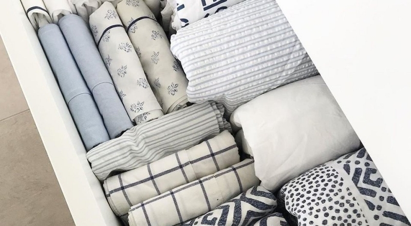Комод еще один удобный способ хранения текстиля в спальне. Вы можете использовать столешницу для мелочей и декора, а пространство внутри для белья и полотенец. Если нет необходимости делить комод с другими вещами, можно рассортировать текстиль: например, в один ящик отправить постельное белье, в другой полотенца и скатерти и т.д.