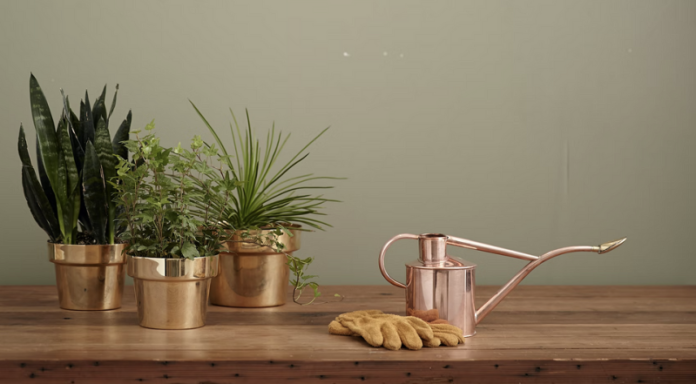 Поливать комнатные растения из кружек или пластиковых бутылок неудобно, а хранить эти емкости рядом с цветами просто неэстетично. Заведите красивую металлическую лейку лаконичной формы с длинным носиком. Лучше всего, если она будет однотонной, в одном из оттенков палитры комнаты. С таким аксессуаром больше не придется тянуться к далеко или высоко стоящим растениям, а заодно он органично впишется в интерьер.