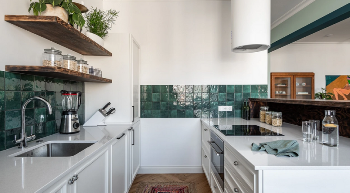 Полки в цвет стен, декоративные композиции и секции для вина подготовили красивые идеи открытого хранения на кухне.