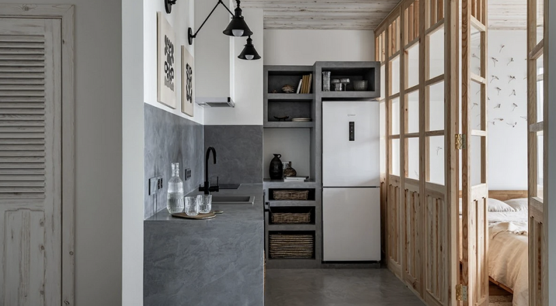 Свою кухню дизайнер Катерина Караваева спроектировала по-настоящему оригинально: вместо монолитного гарнитура собрана система хранения из бетонных блоков. Чтобы визуально облегчить пространство, с одной стороны отказались от верхних шкафов и подобрали все детали в лаконичных прямых линиях. Это было важно для того, чтобы квартира с открытой планировкой не была перегружена и воспринималась как место для отдыха и расслабления. Пол в зоне готовки выполнен из микробетона, поэтому он кажется логическим продолжением гарнитура и кухонного фартука. А множество плетеных корзин и подносом добавляют пространству отпускной атмосферы.