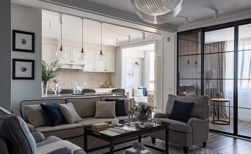 Но это не значит, что в таких помещениях нет зонирования. Есть. Оно выполняется использованием разных отделочных материалов. Еще один популярный прием зонирование с помощью мебели: дивана, барной стойки, кухонного острова и т.д. Для таких интерьеров характерна симметрия. Этот принцип используют и при планировке помещений, и при расстановке мебели.