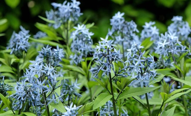 Популярные сорта садовых амсоний: Spring Sky, Blue Ice, Short Stack, Storm Cloud.